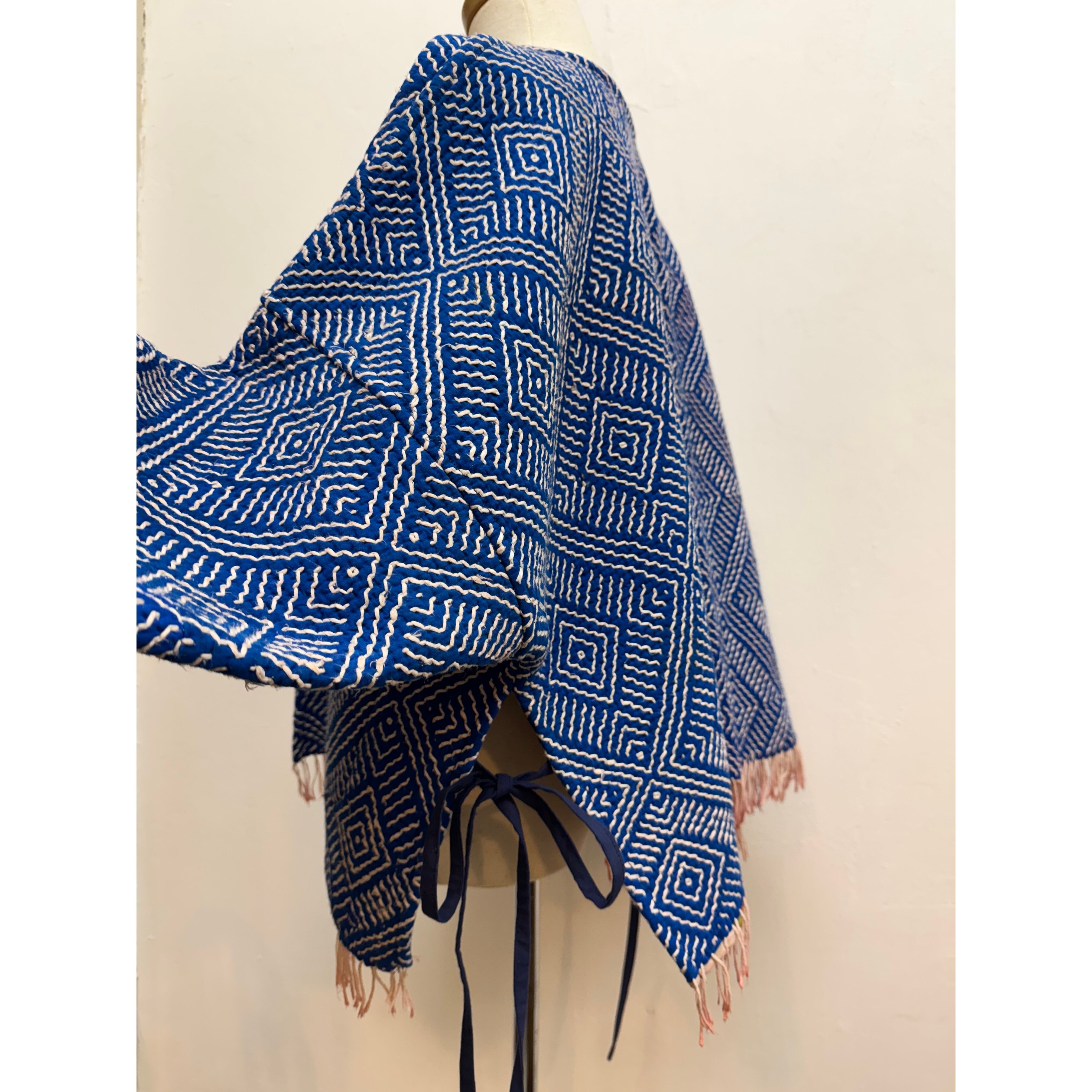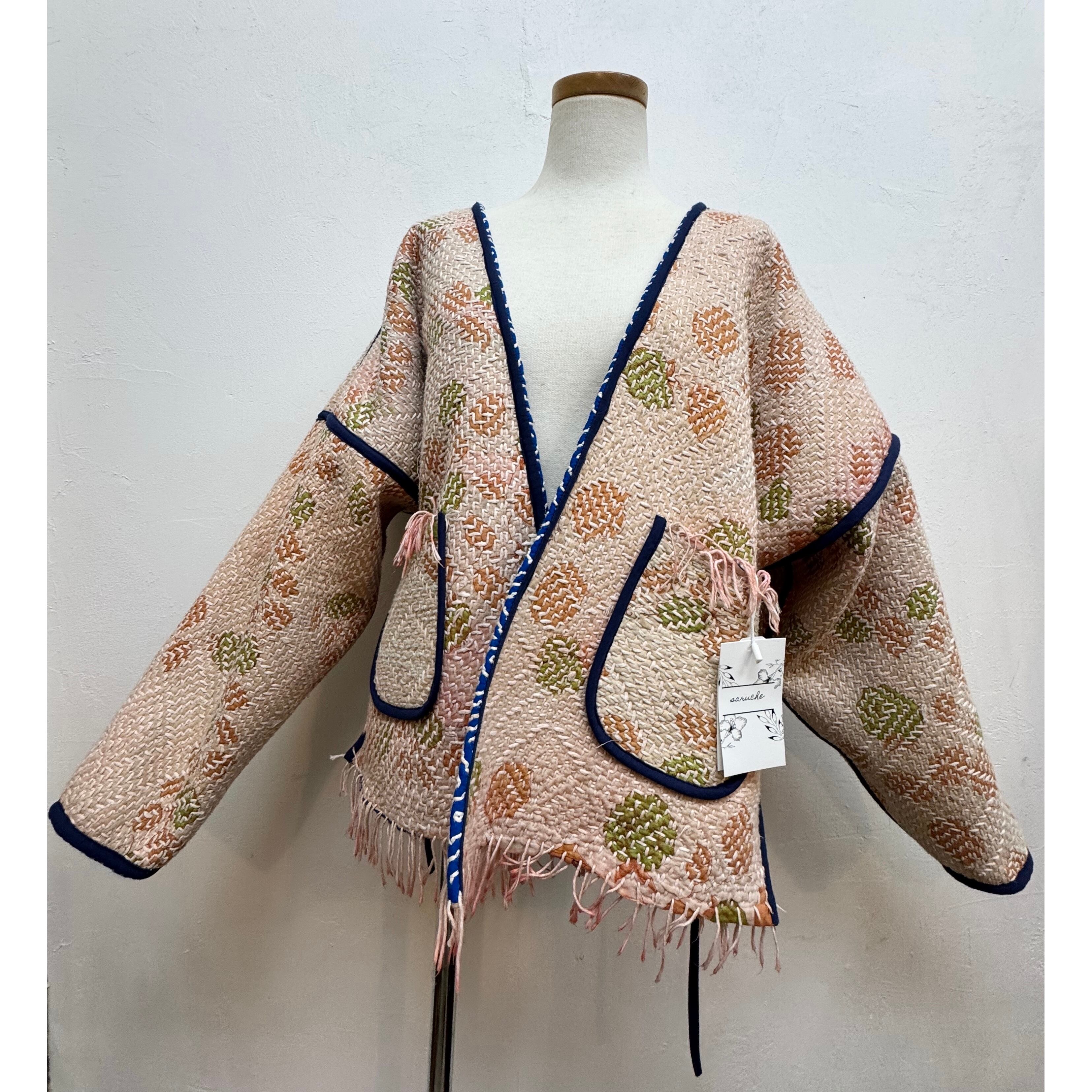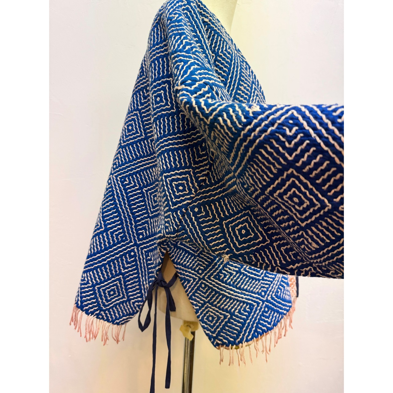 きれいな幾何学模様がいくつもの時間をかけて手刺繍された特別なラリーキルトから製作したジャケット。