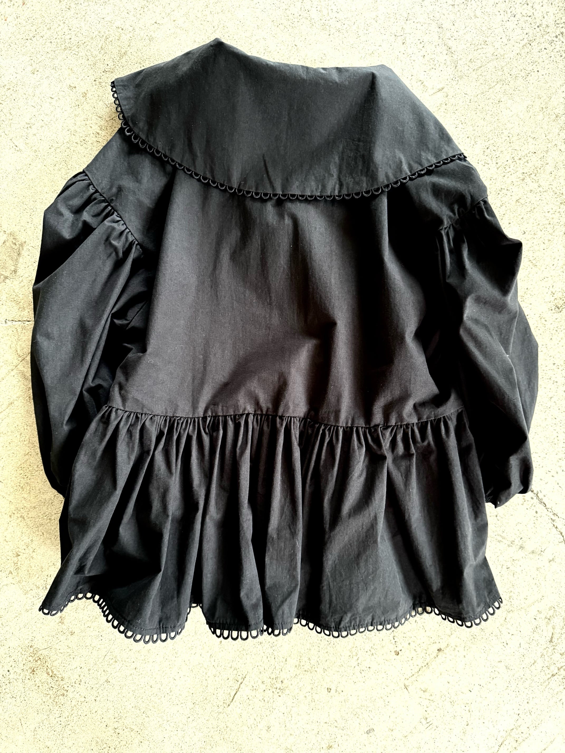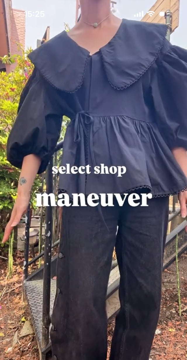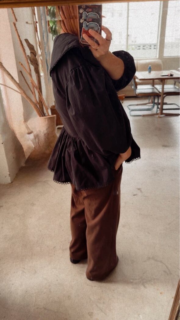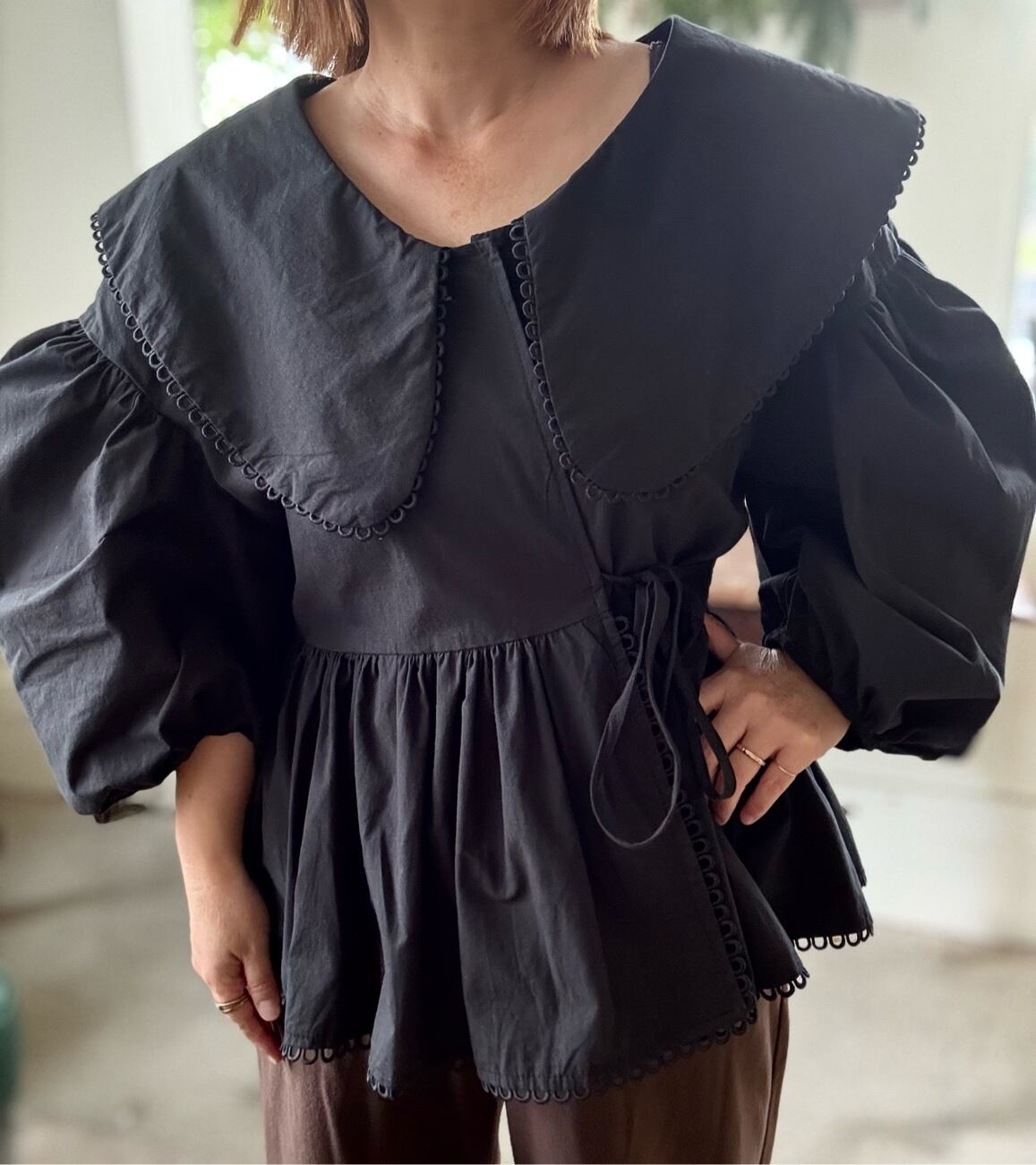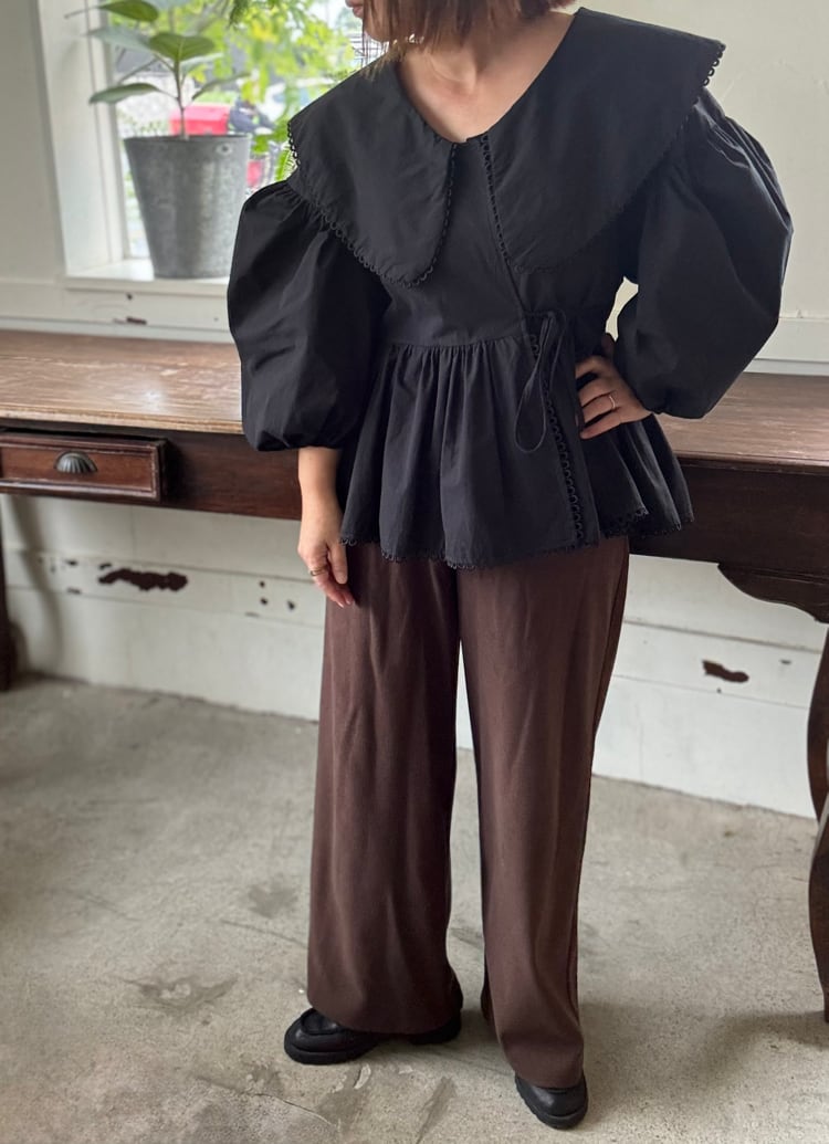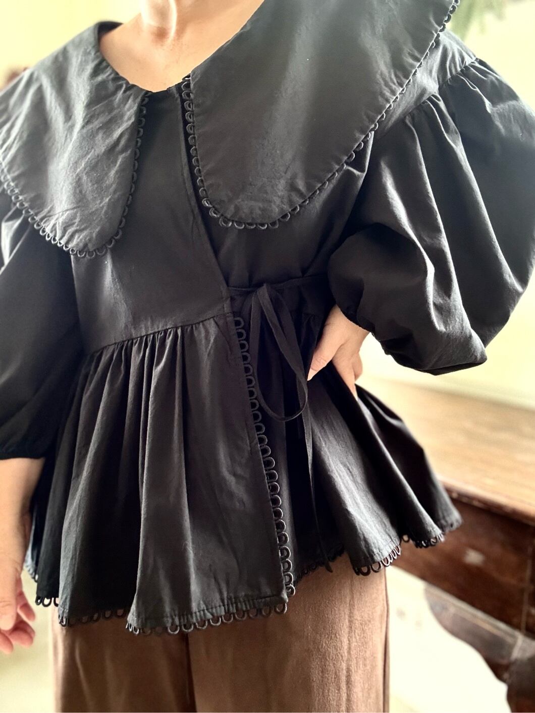 ラップブラウスだからウエストのリボンで自分好みのウエストラインが作れます。