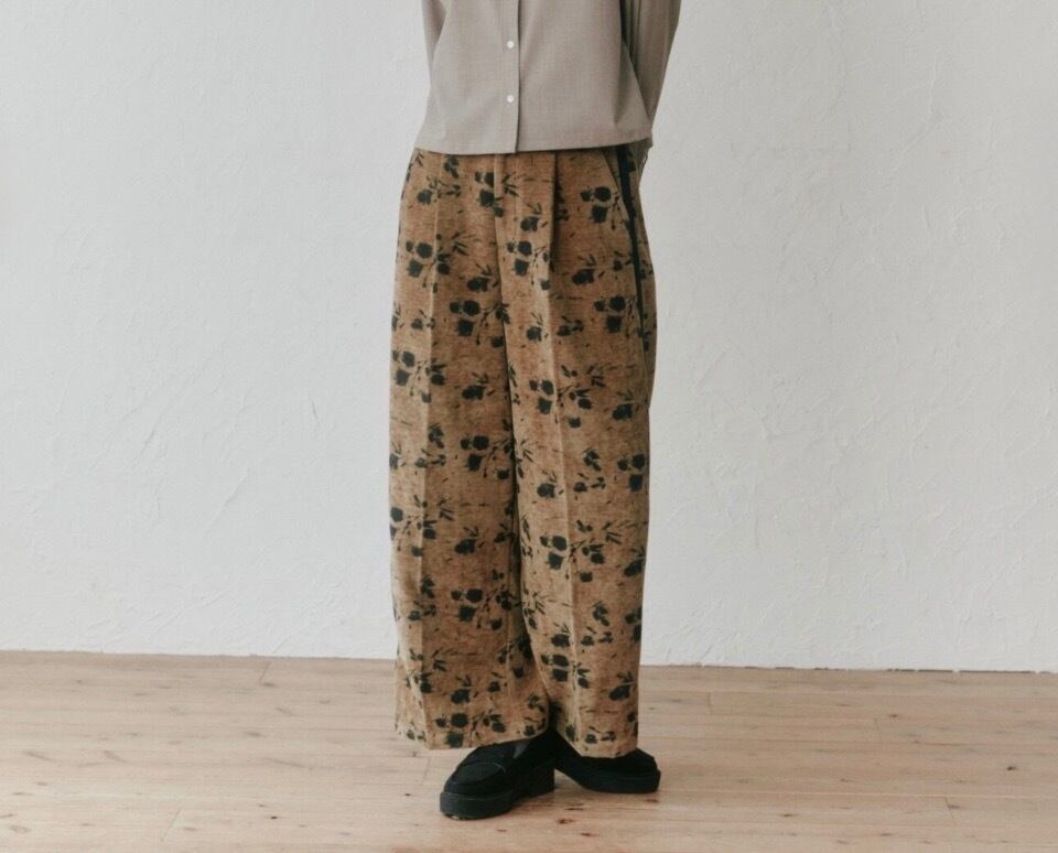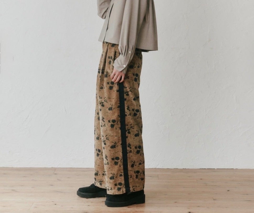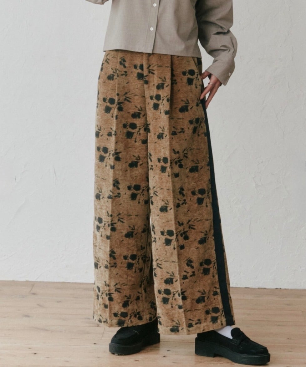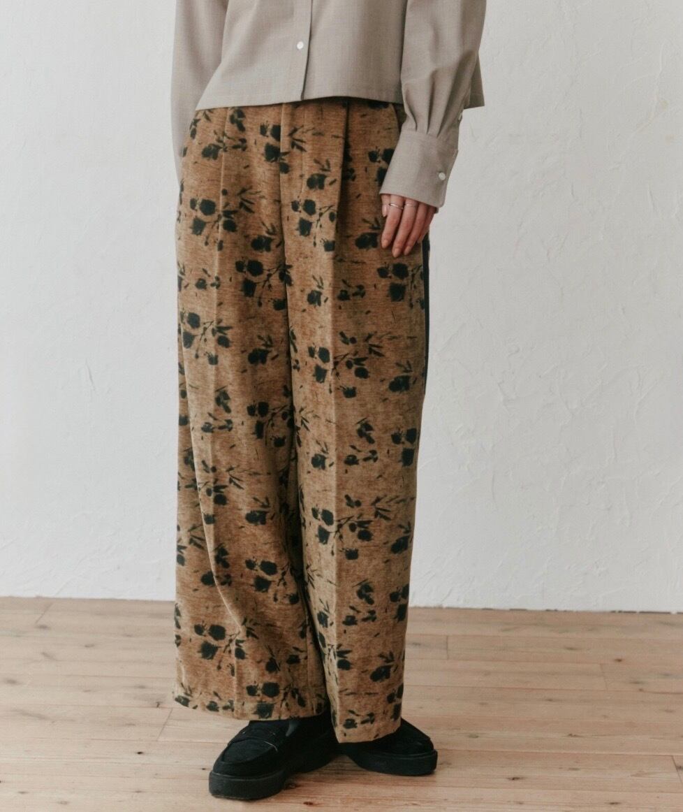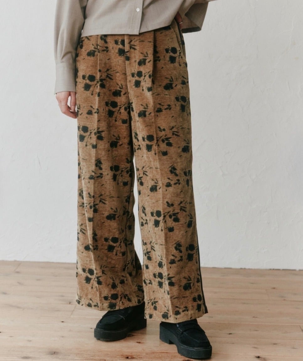 別珍生地のタックパンツ、花柄でシルバーラメの入った生地なので動くとキラキラして可愛いです。トップスに合わせるだけでサマになるデザインが魅力!!