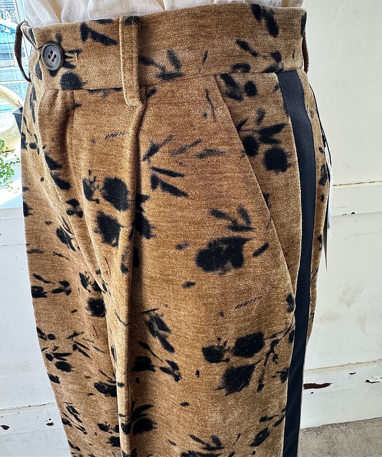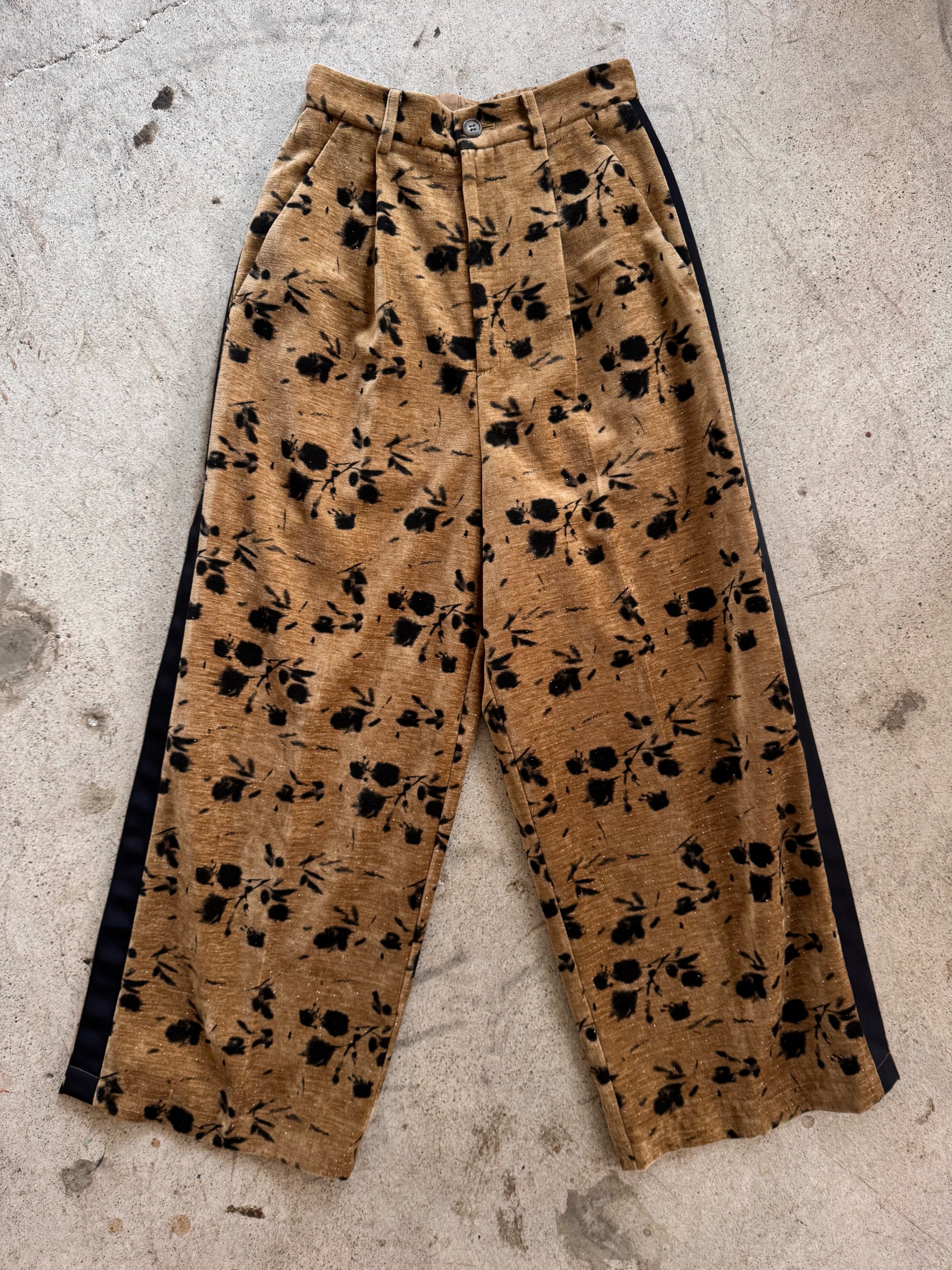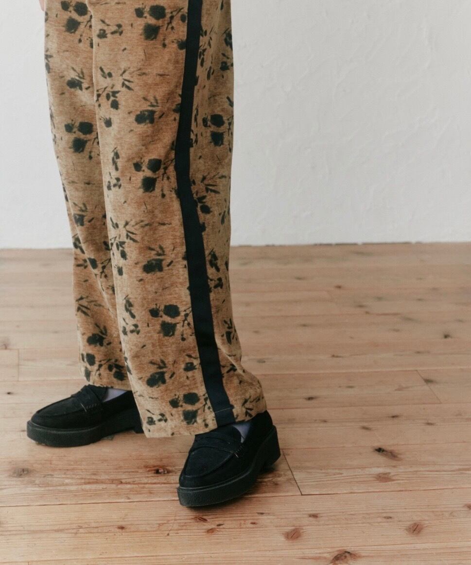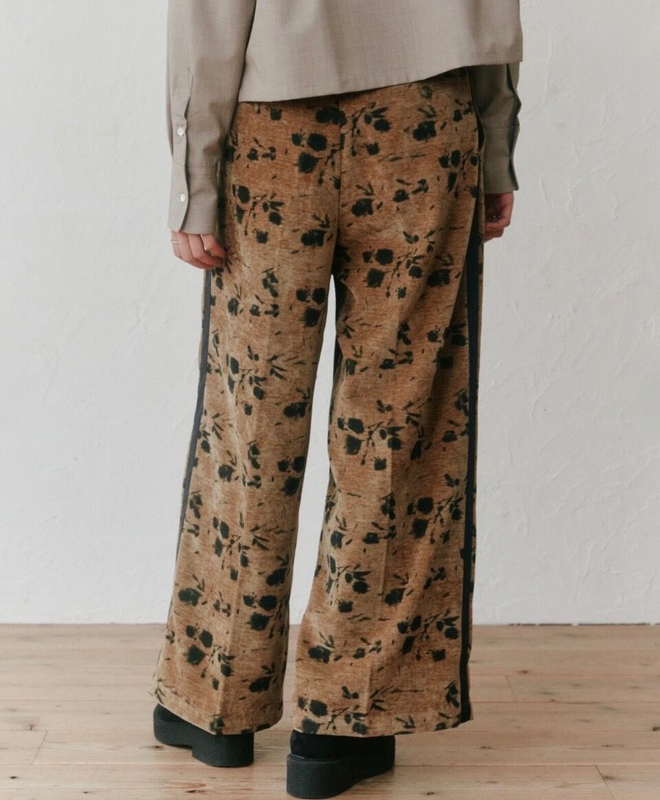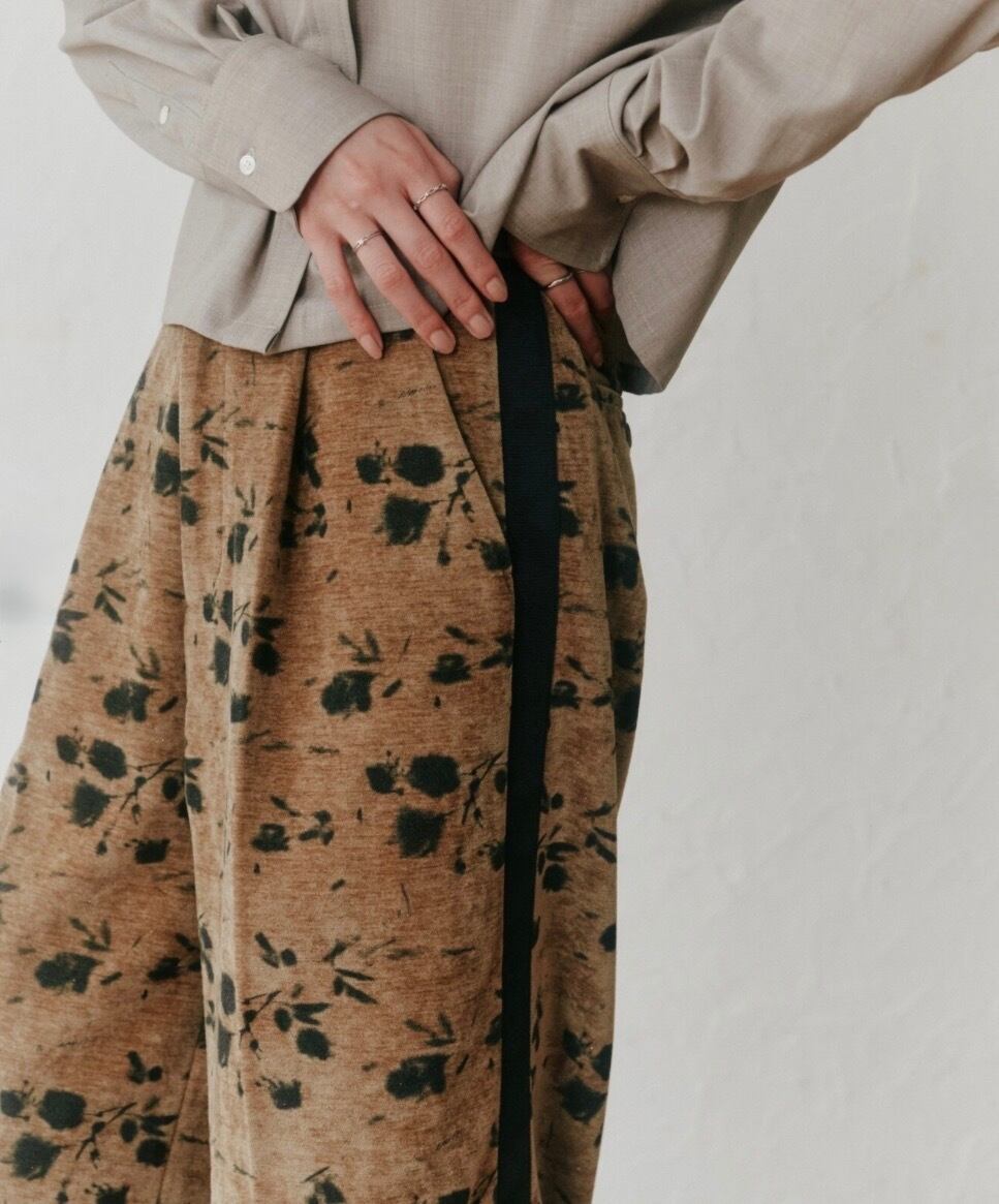 別珍生地のタックパンツ、花柄でシルバーラメの入った生地なので動くとキラキラして可愛いです。トップスに合わせるだけでサマになるデザインが魅力!!