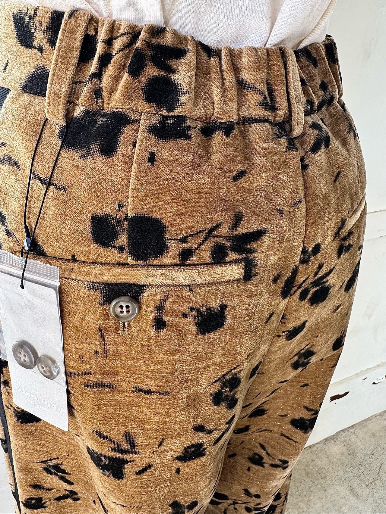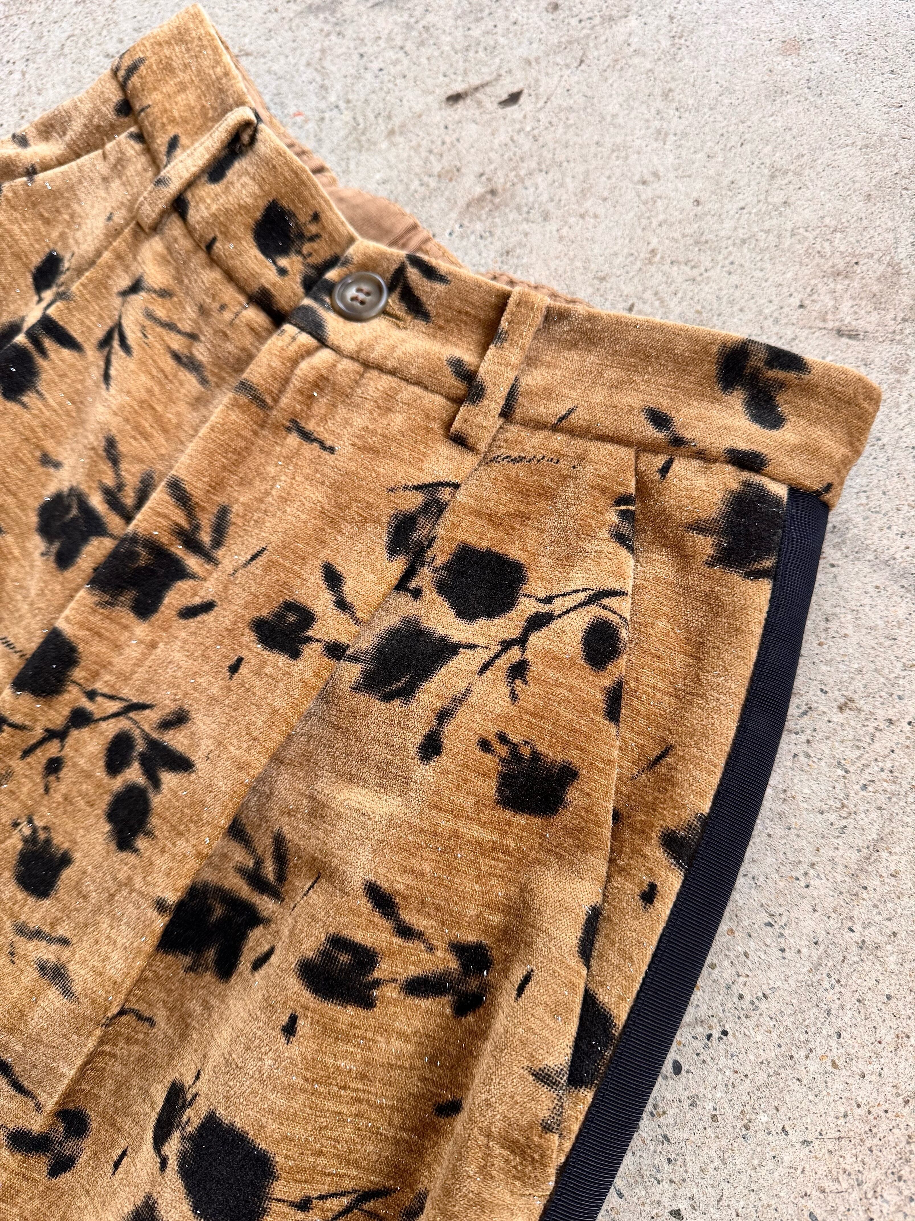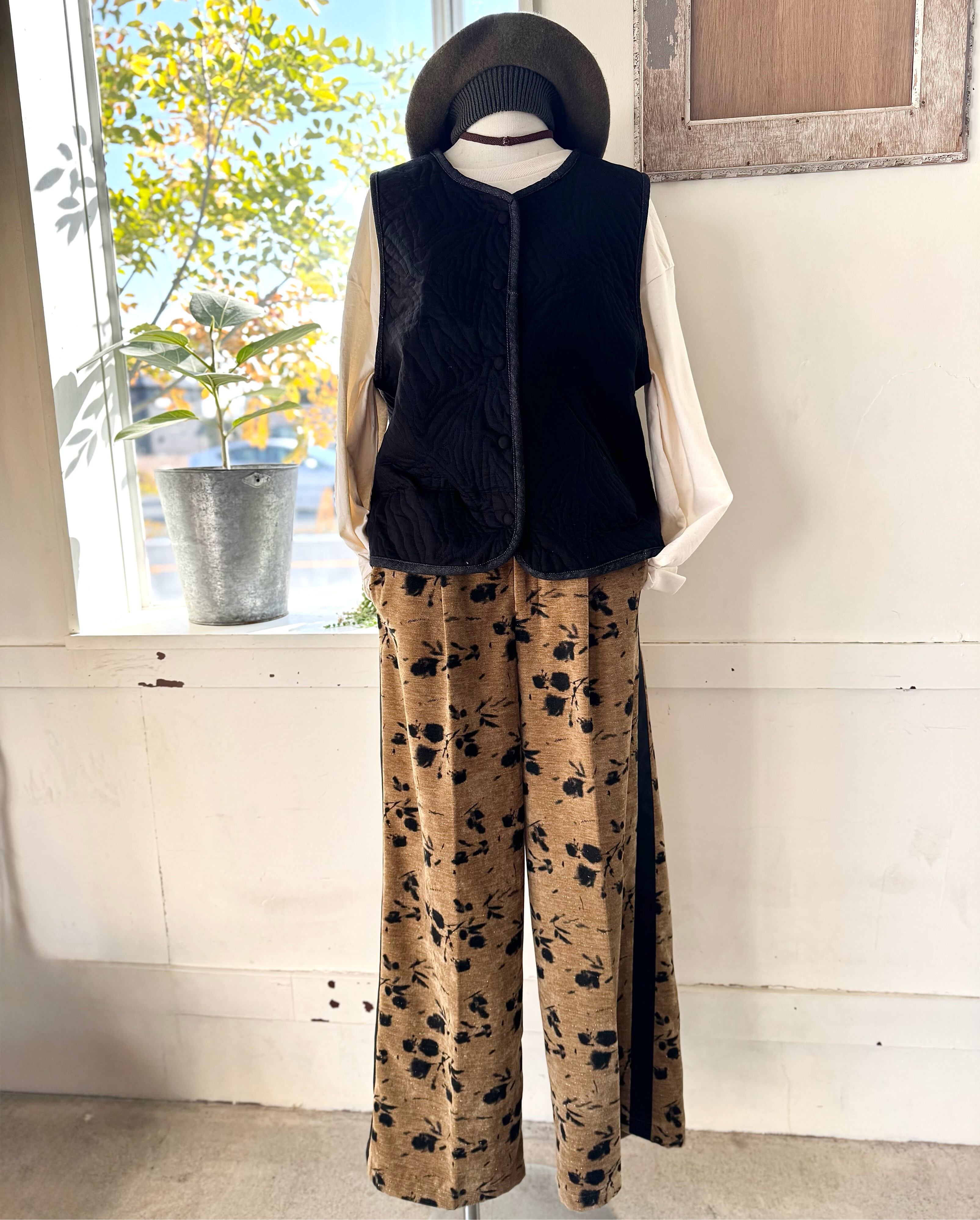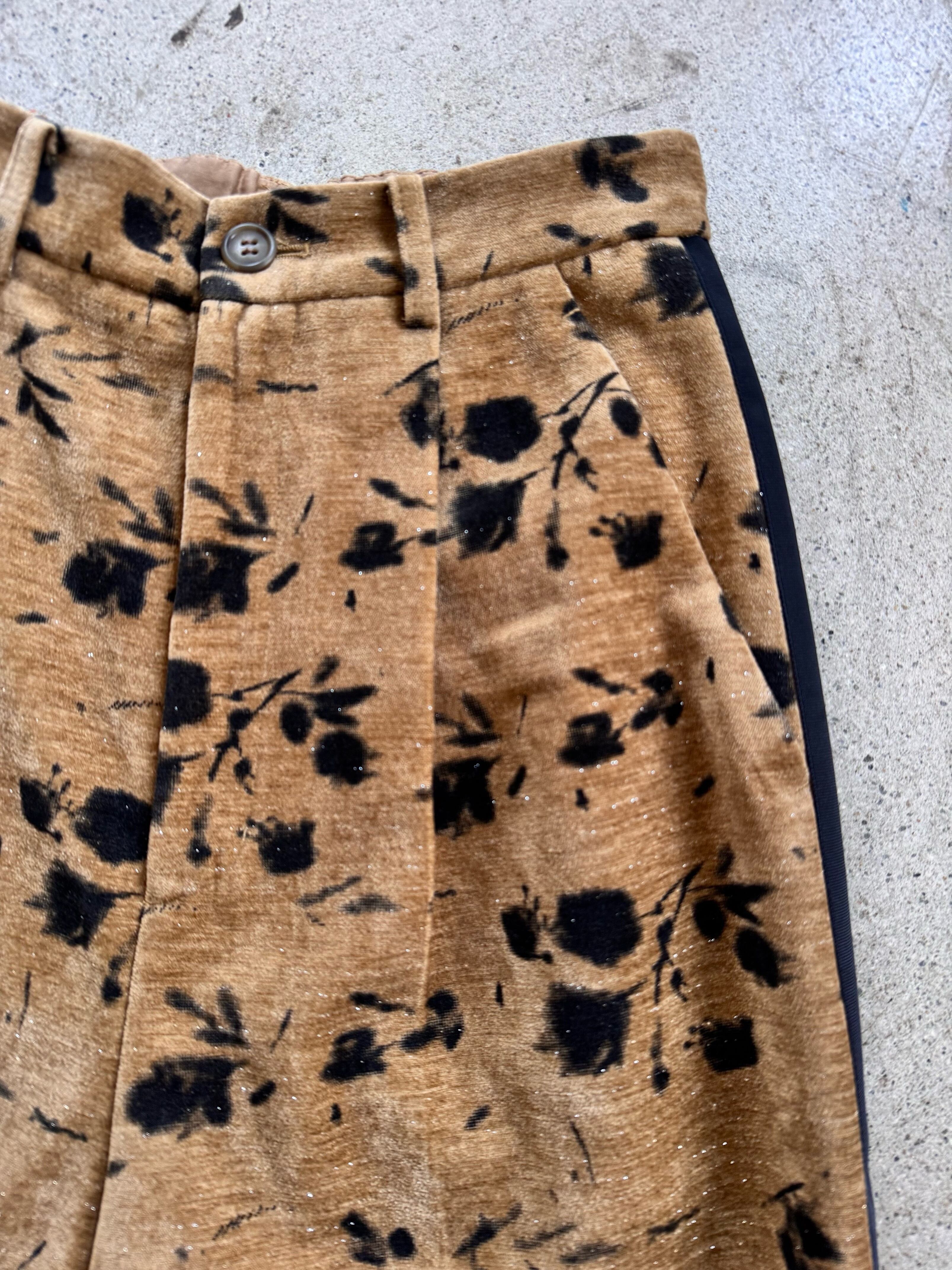 別珍生地のタックパンツ、花柄でシルバーラメの入った生地なので動くとキラキラして可愛いです。トップスに合わせるだけでサマになるデザインが魅力!!