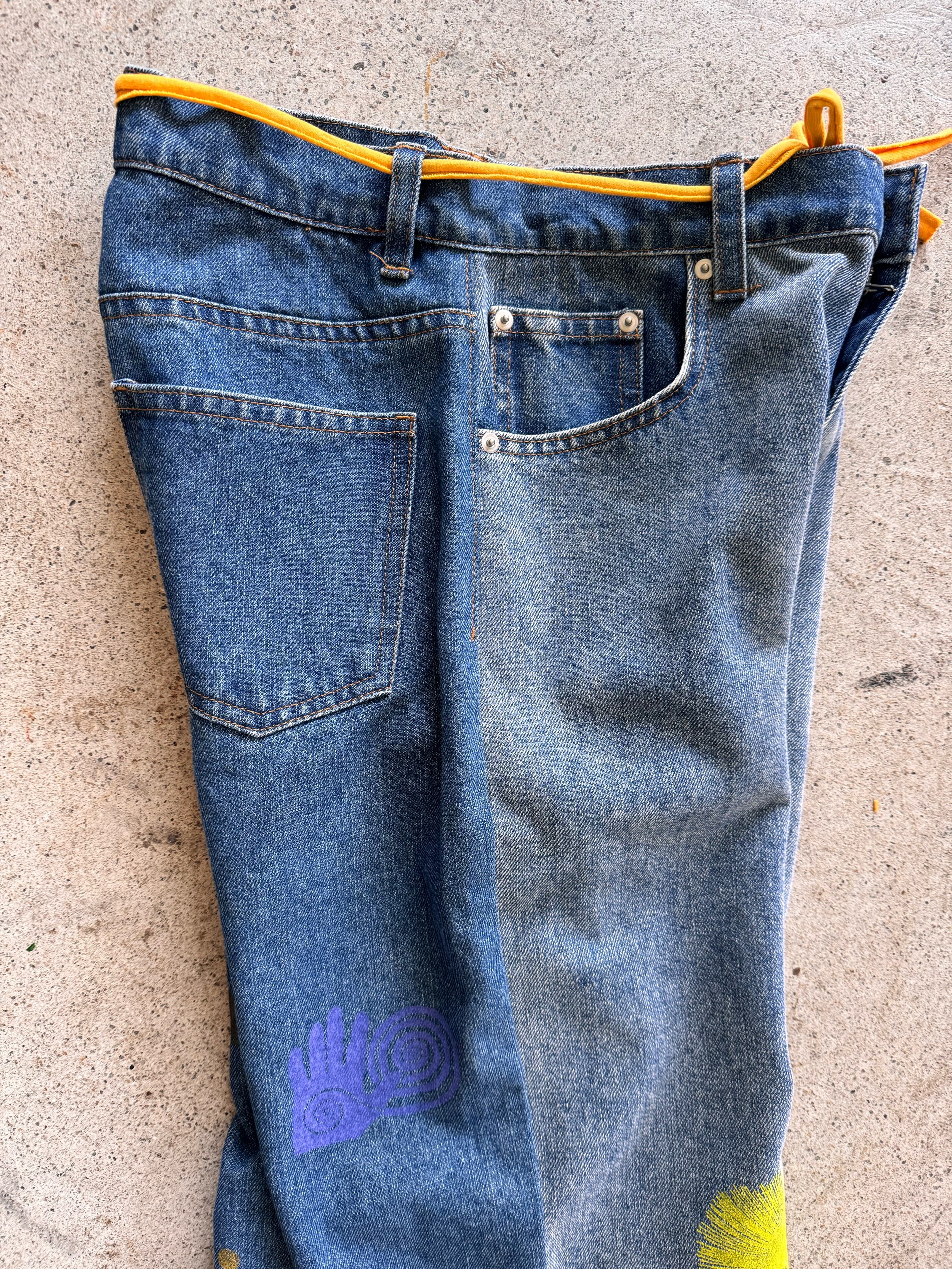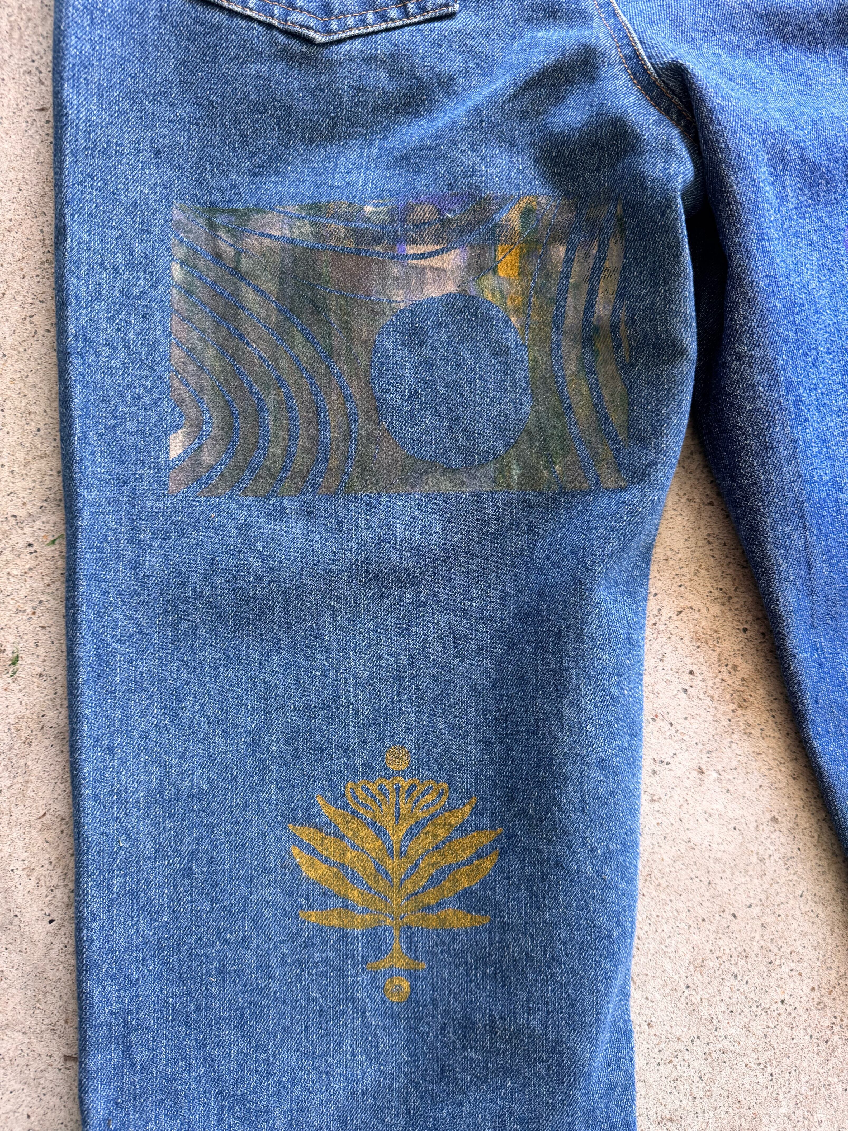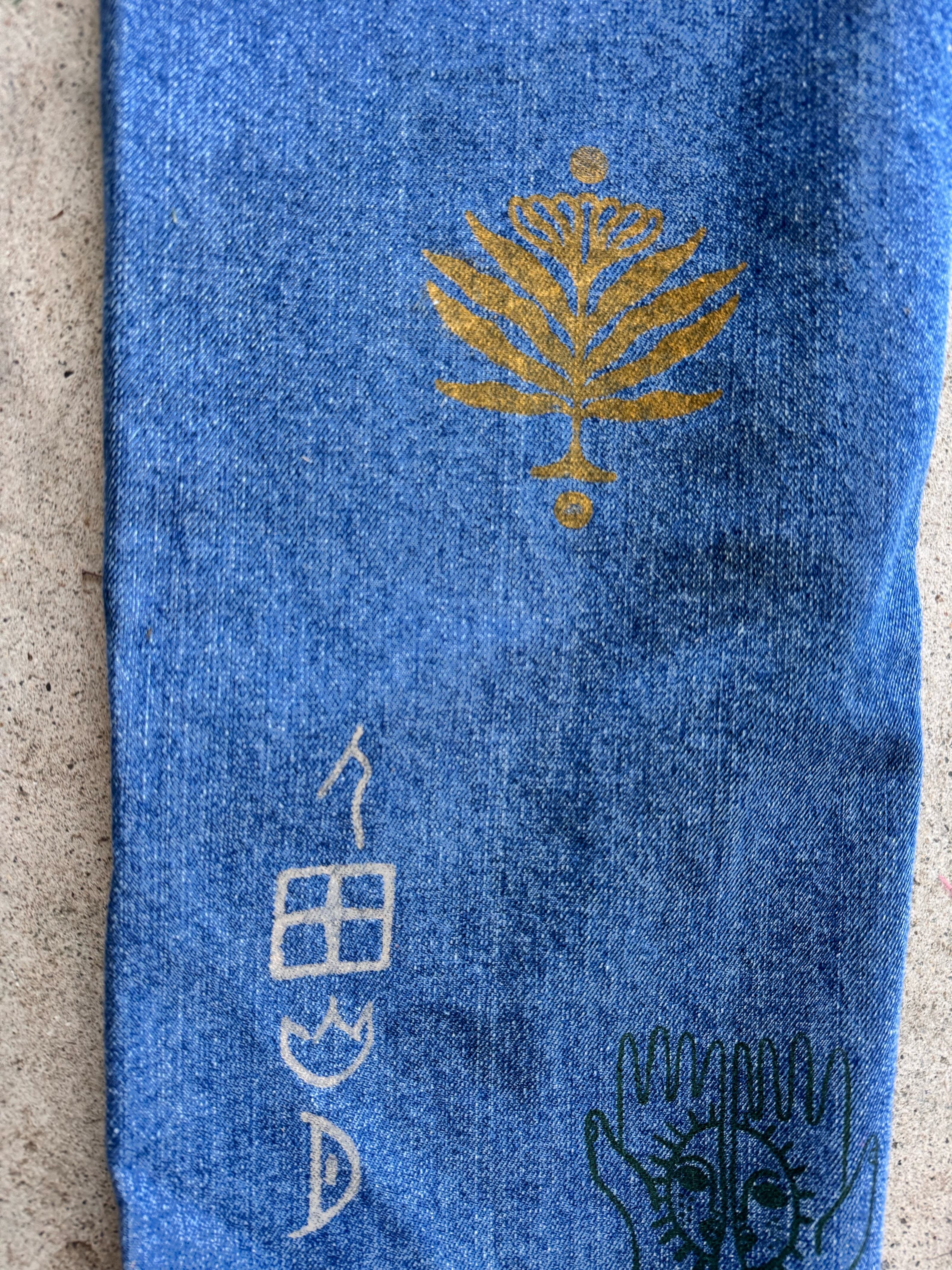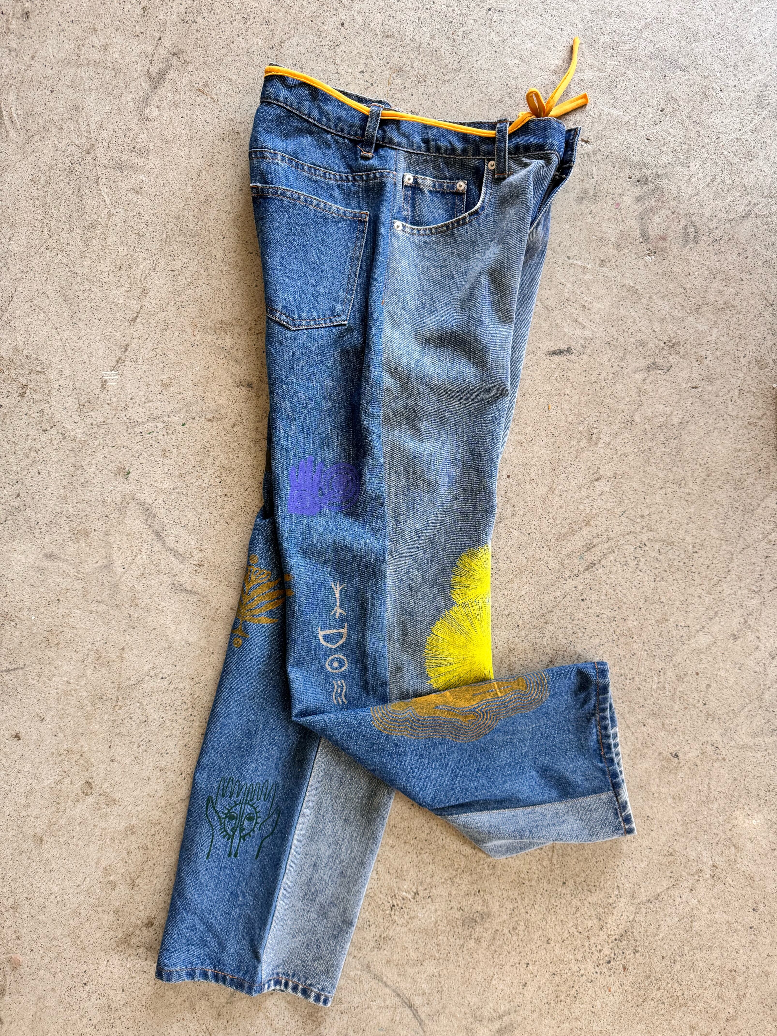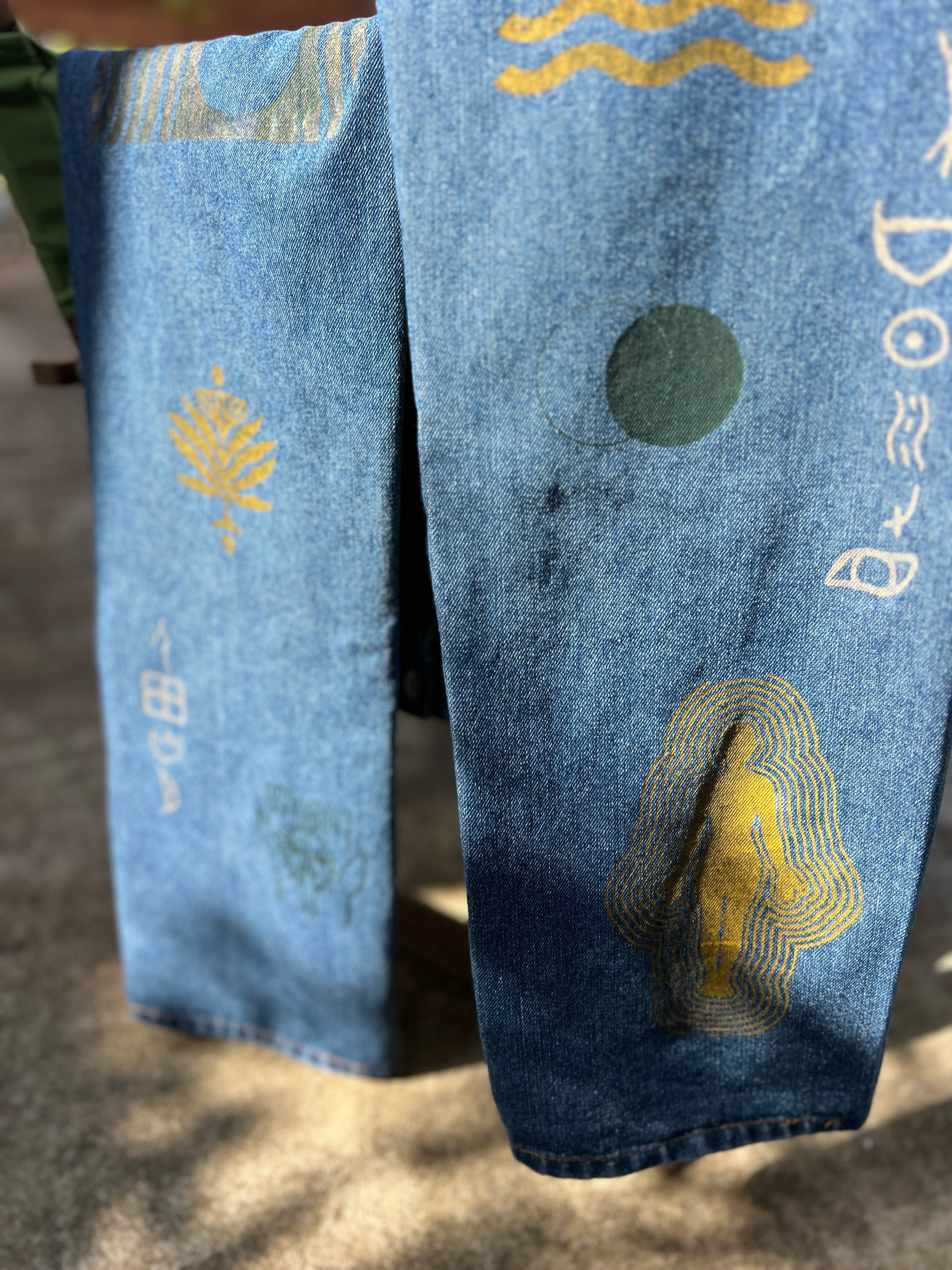 当店オリジナルのシルクプリントを施したデニムパンツ