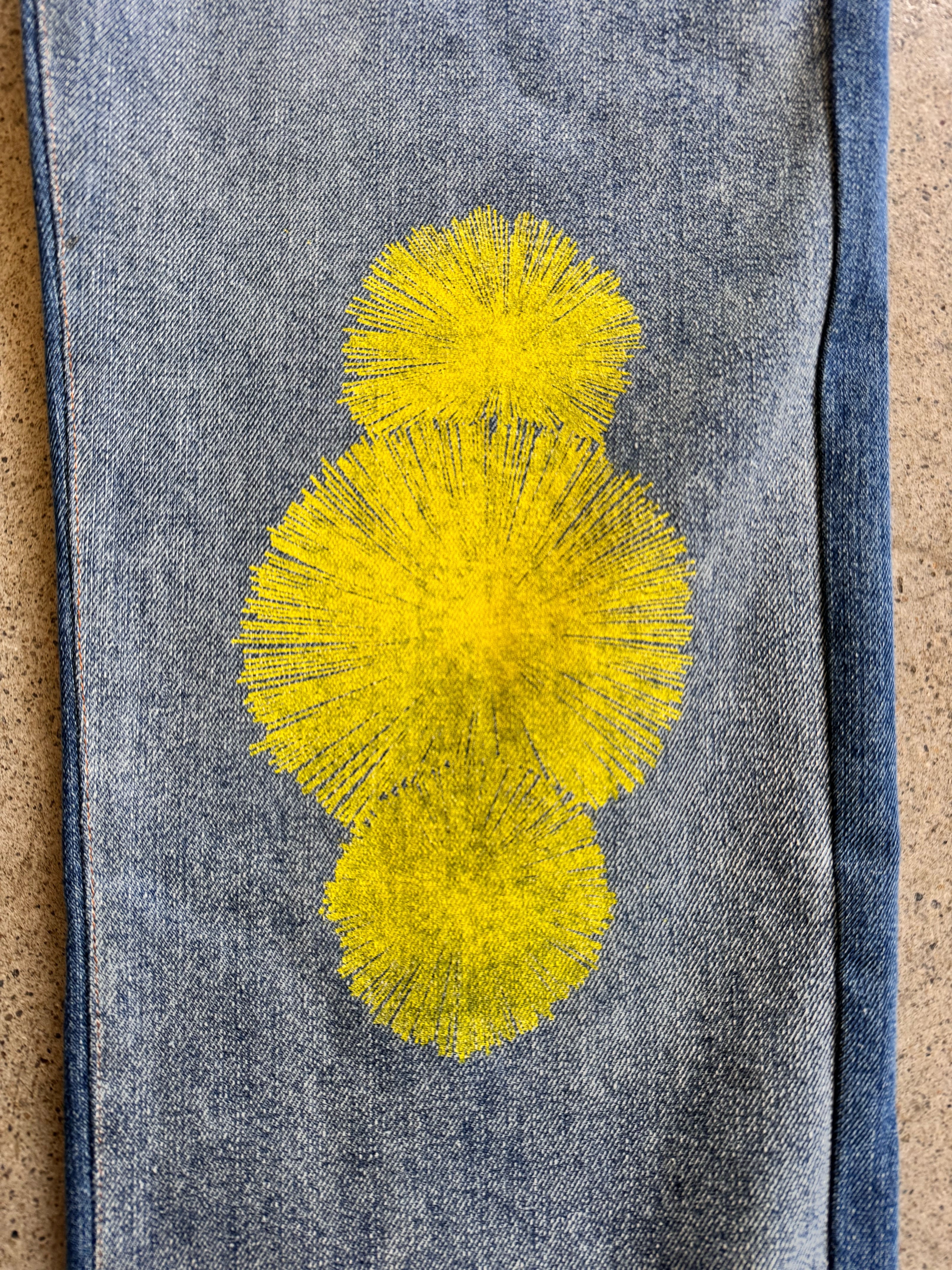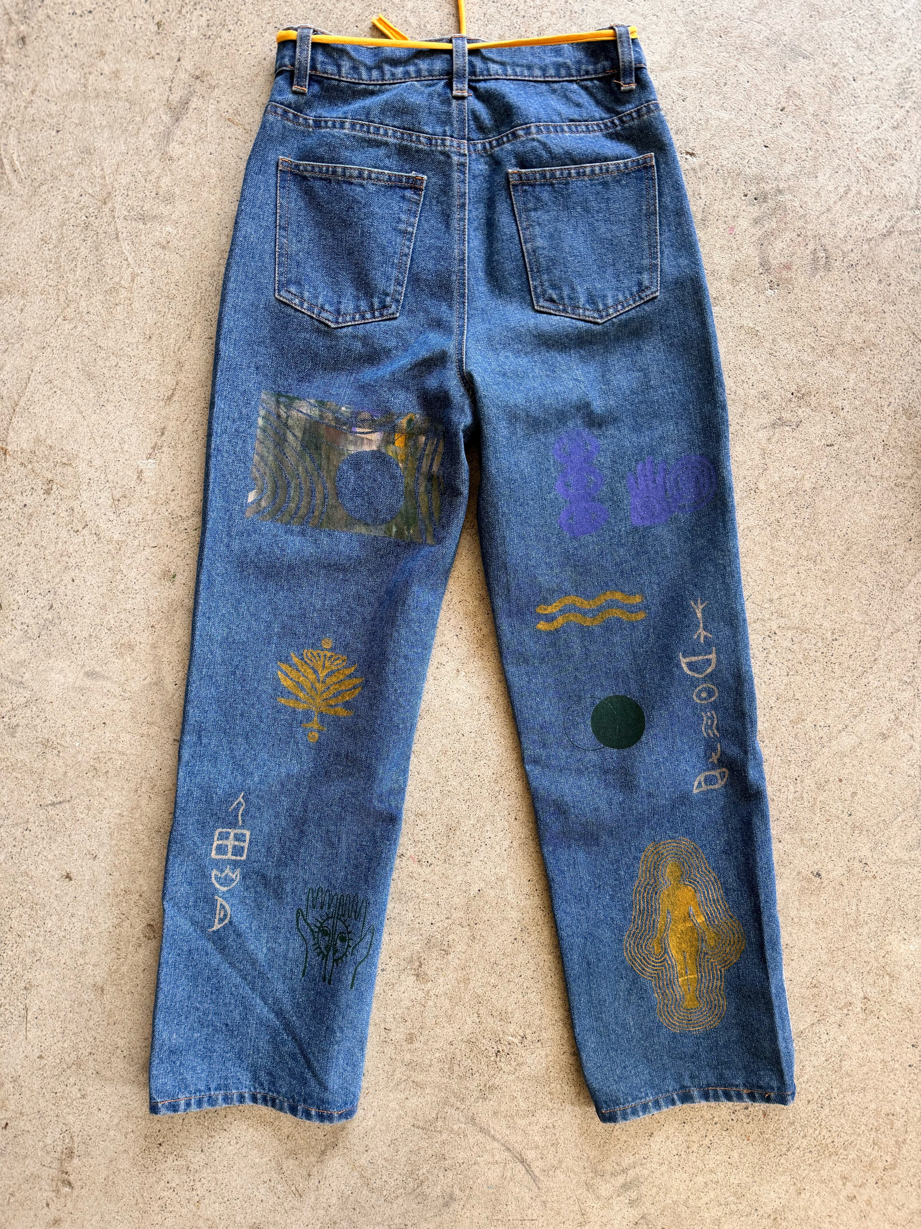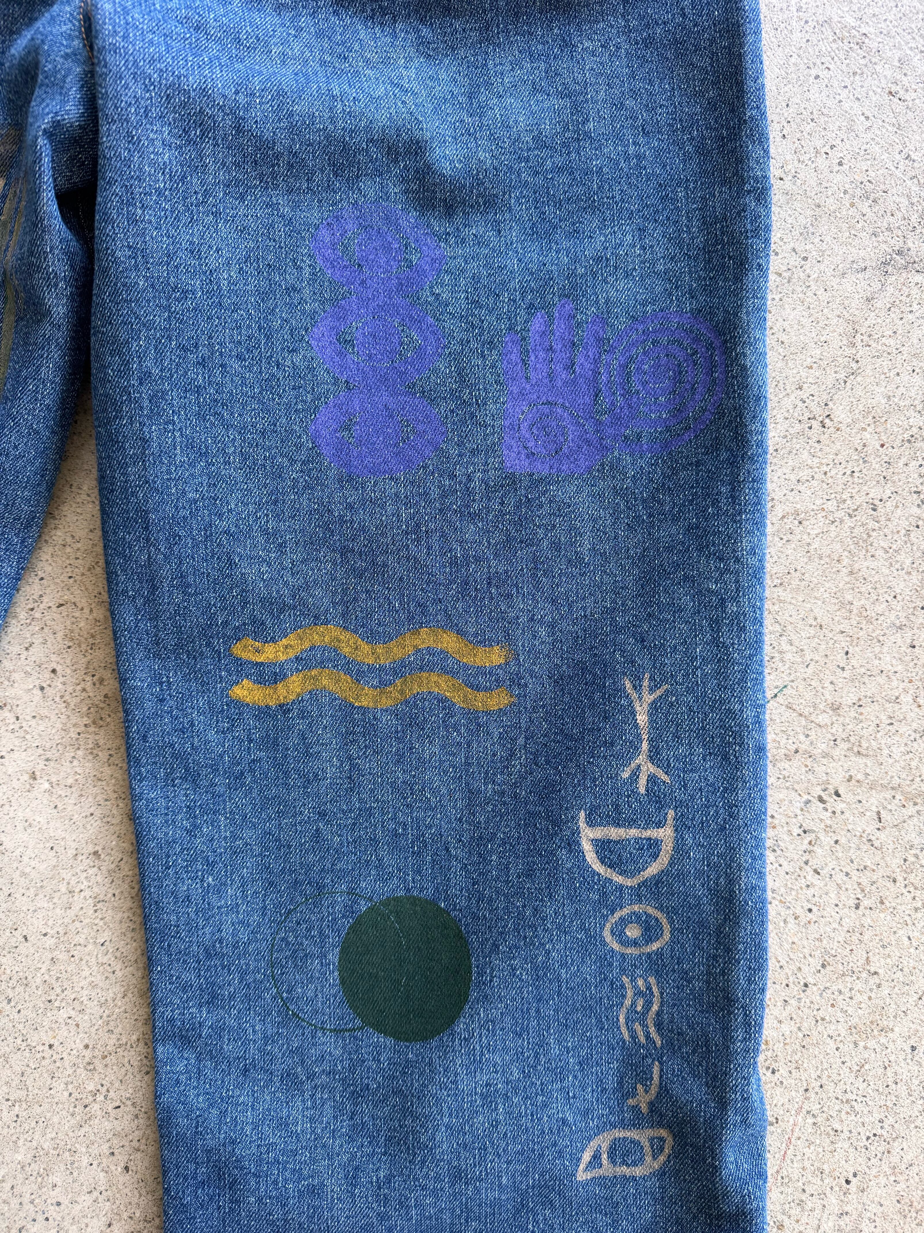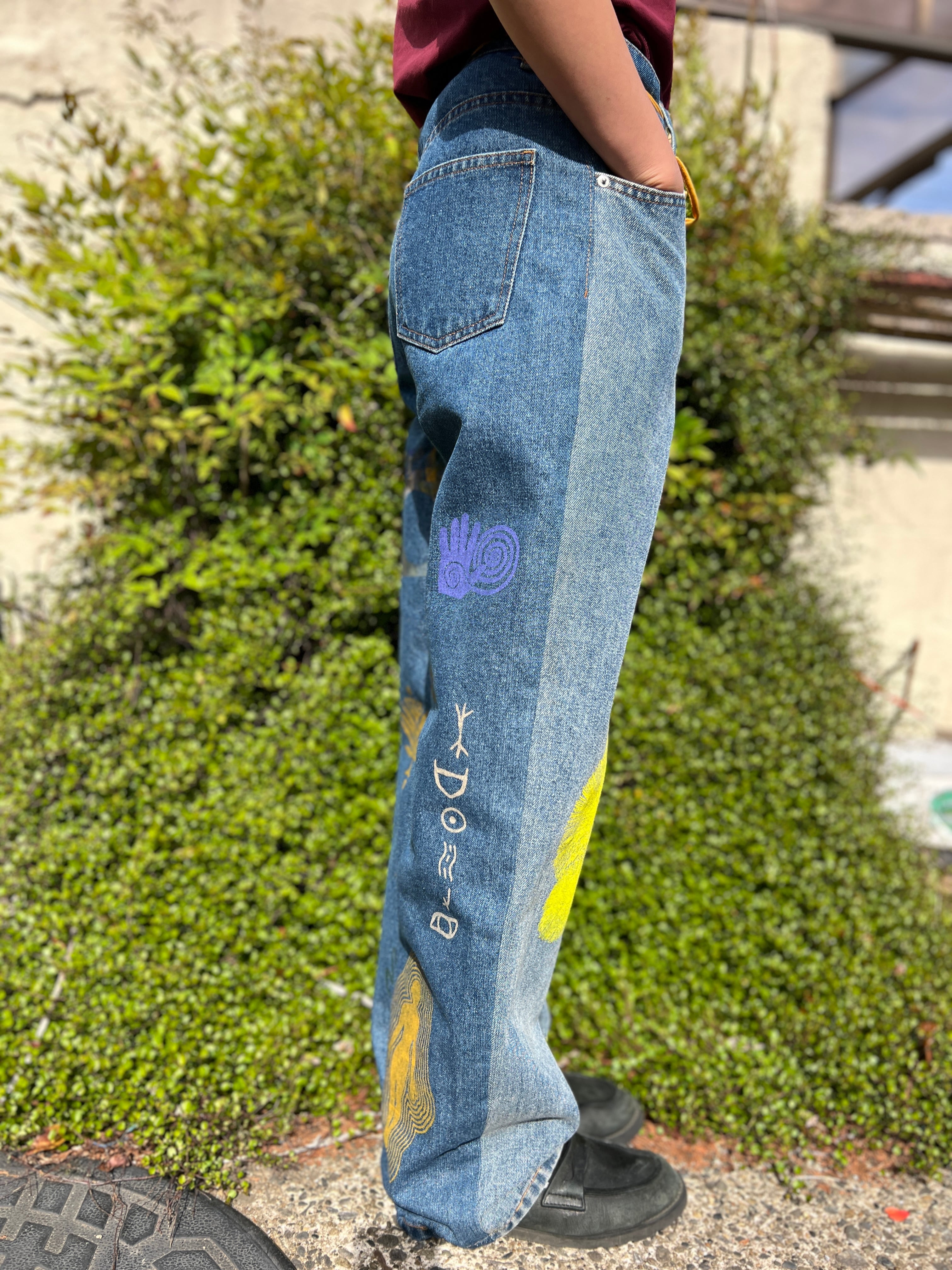 当店オリジナルのシルクプリントを施したデニムパンツ