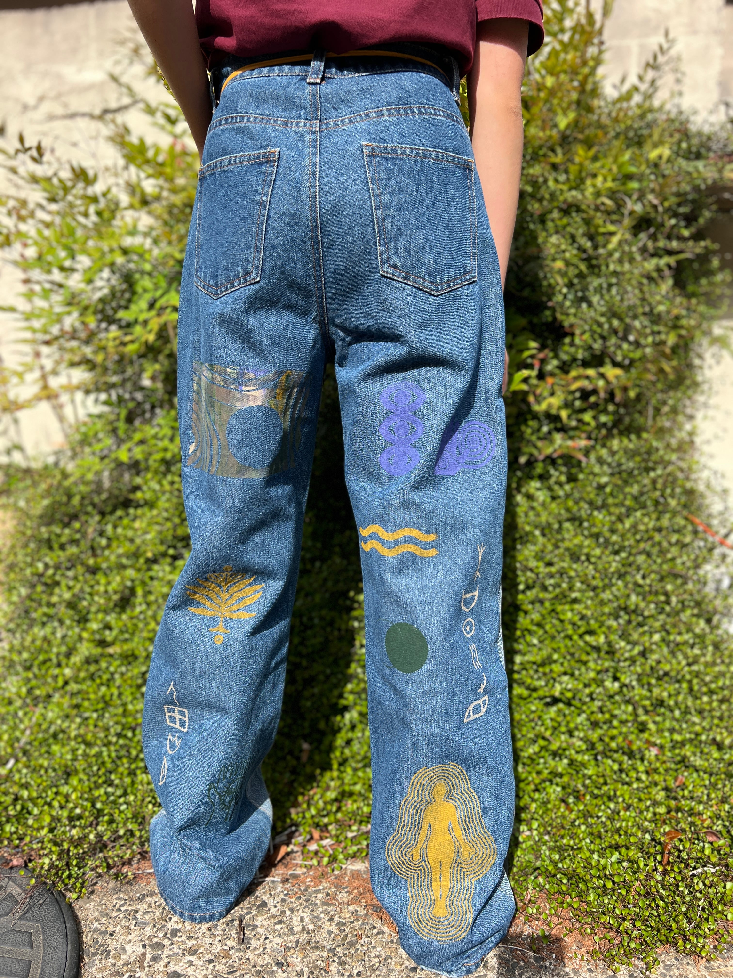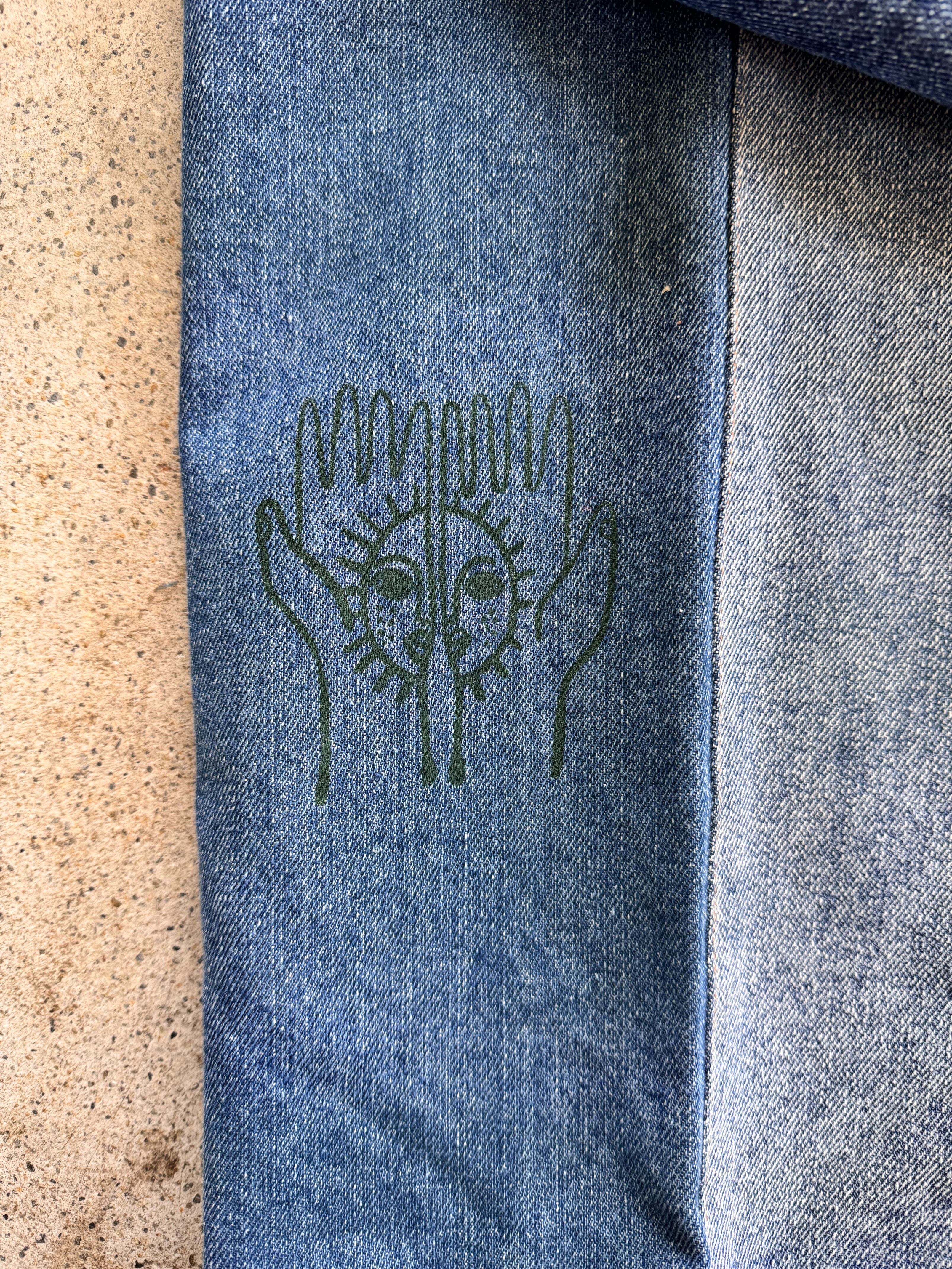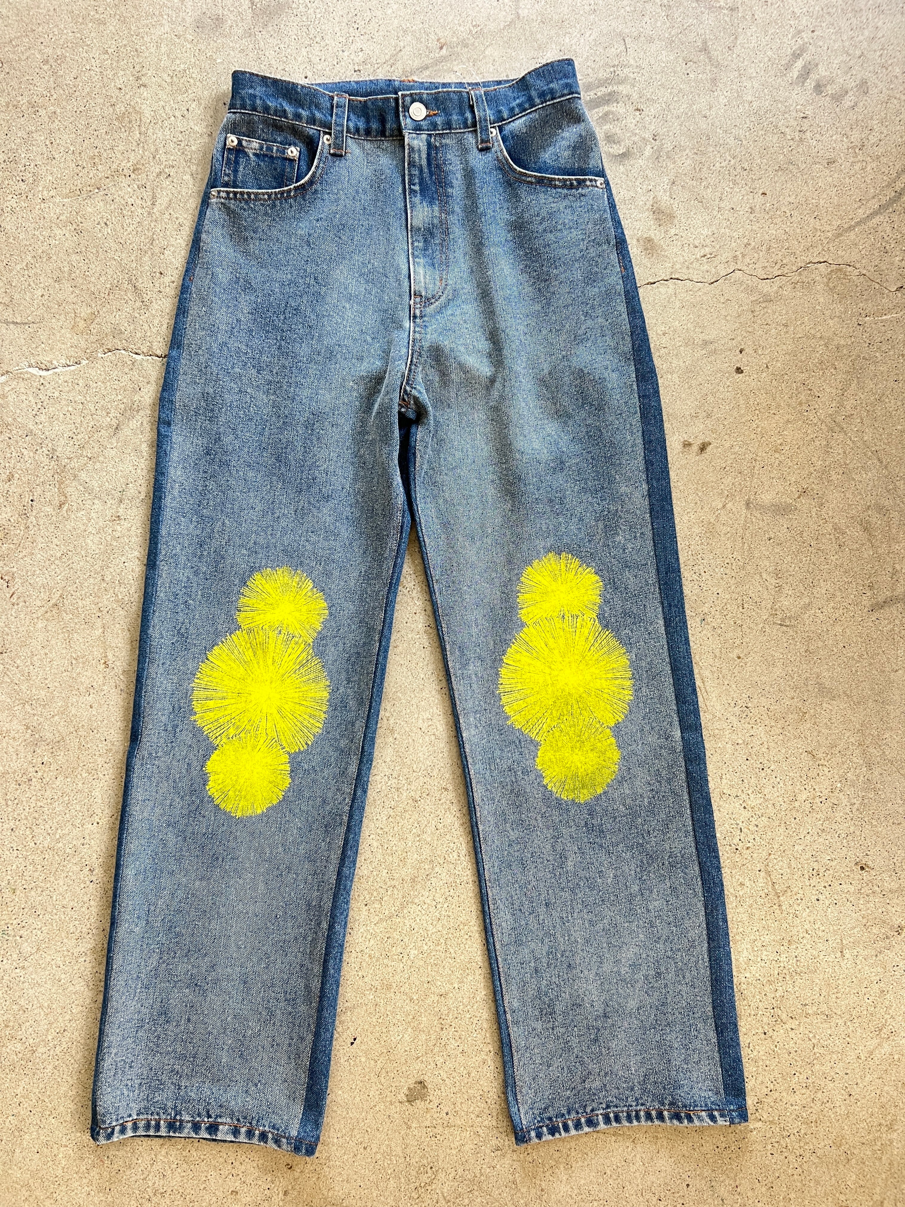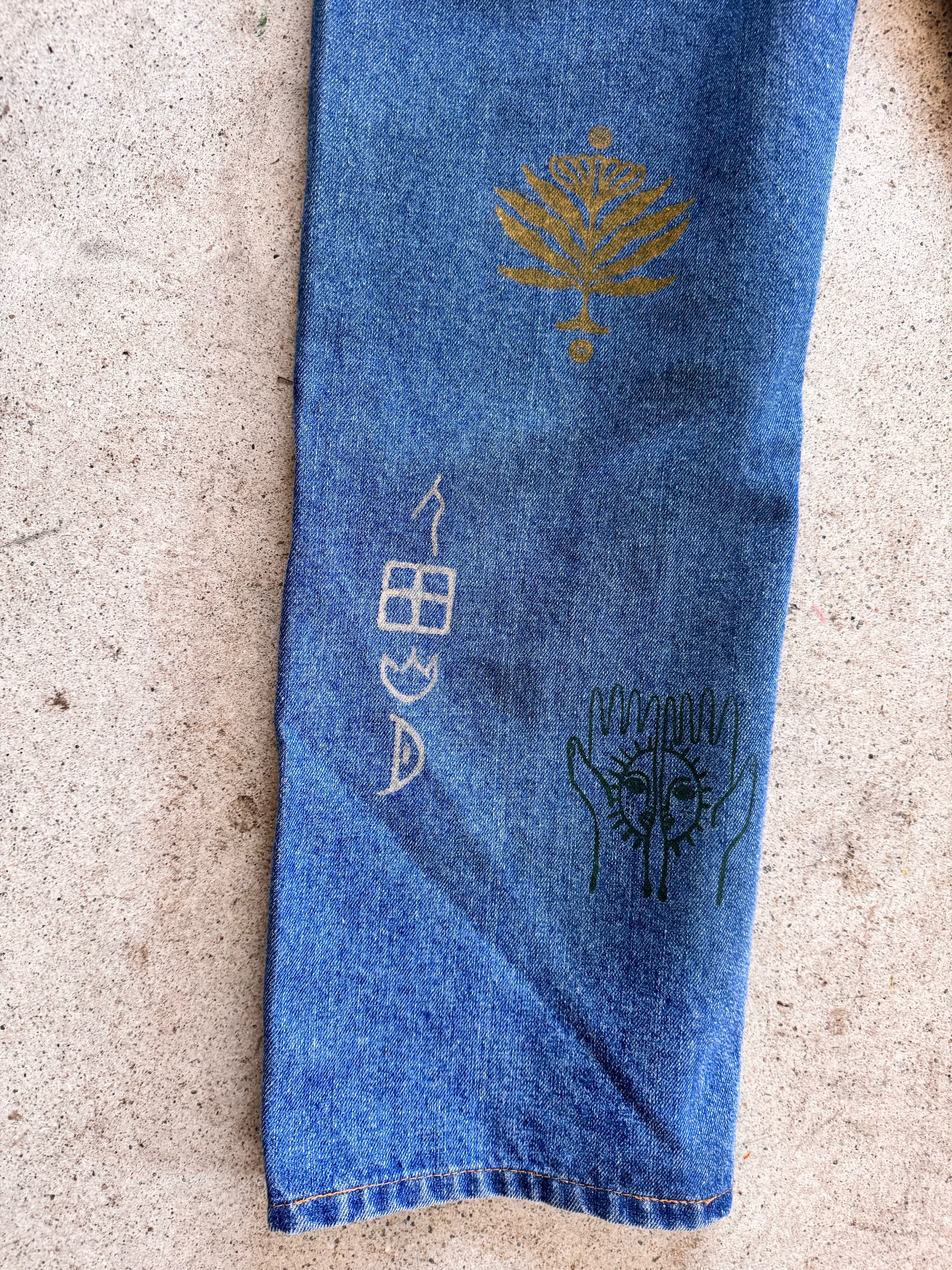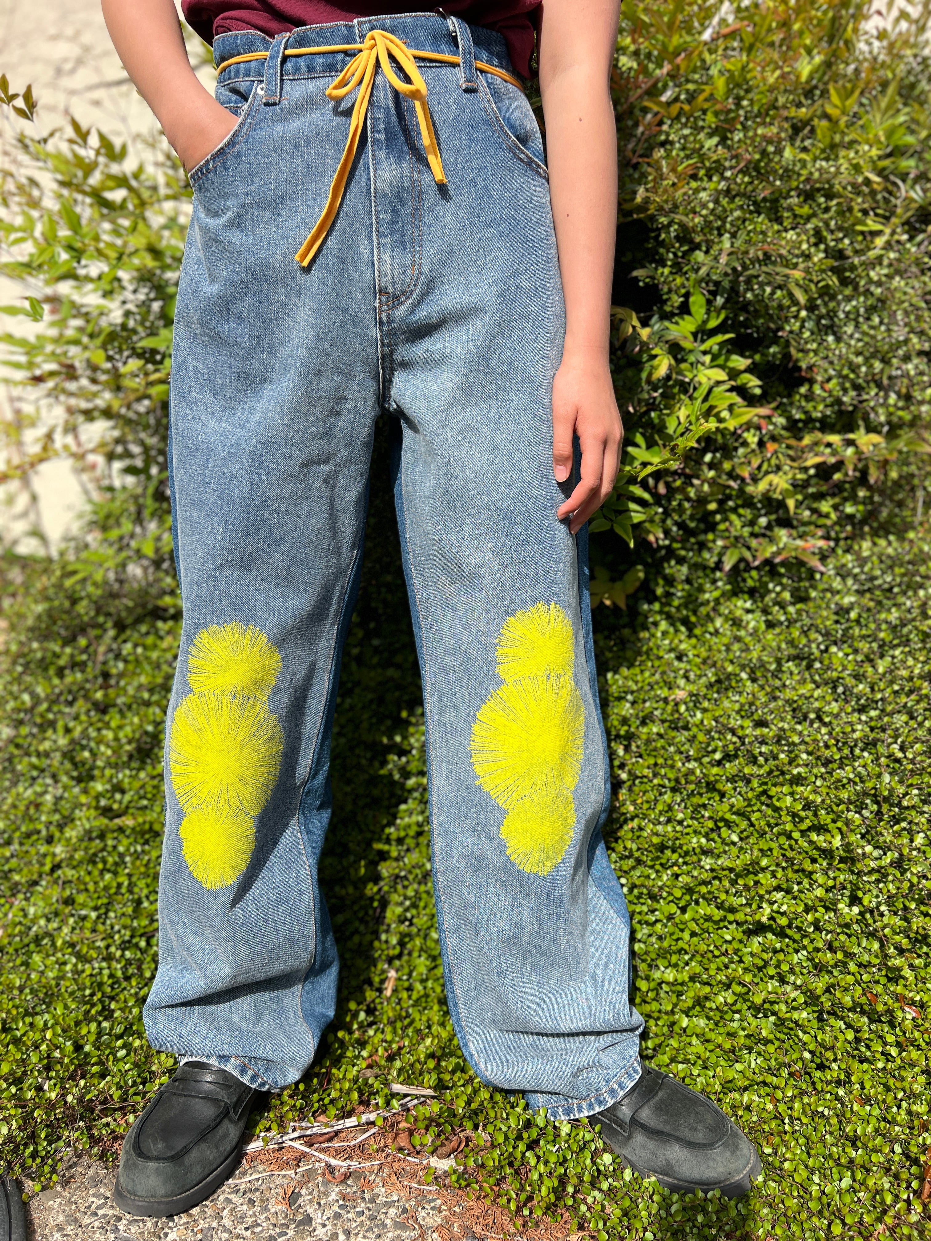 当店オリジナルのシルクプリントを施したデニムパンツ